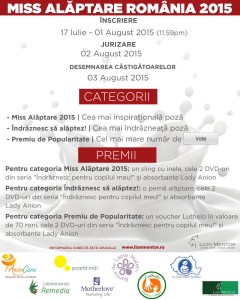 –“Lion Mentor Association” din BUCUREŞTI organizează cea de a doua ediție a concursului foto “MISS ALĂPTARE ROMÂNIA 2015” începând cu data de 17 iulie 2015, ora 12:00 până pe data de 1 august la orele 23:59. Pozele câştigătoare vor fi anunțate pe data de 3 august pe site-ul şi pagina Facebook a asociației.