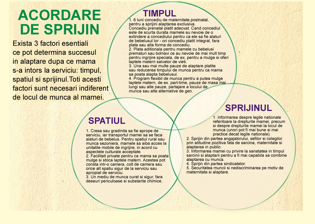 Femeile angajate se confruntă cu provocări și au nevoie de sprijin pentru a reuși la muncă și în alăptare. Oportunitățile pentru sprijinirea mamei sunt la fel de variate ca munca prestată de femei, dar, de obicei, implică facilitarea contactului mamă-copil sau extragerea și depozitarea laptelui matern.
